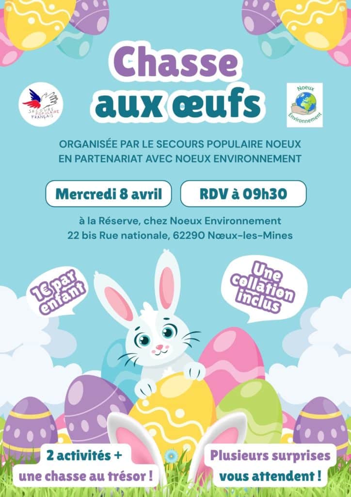Vos enfants de 2 à 10 ans sont invités à participer à la Chasse aux œufs organisée le mercredi 08 avril matin par notre association chez notre partenaire « Noeux Environnement » situé 22 bis rue Nationale, à Noeux les Mines.