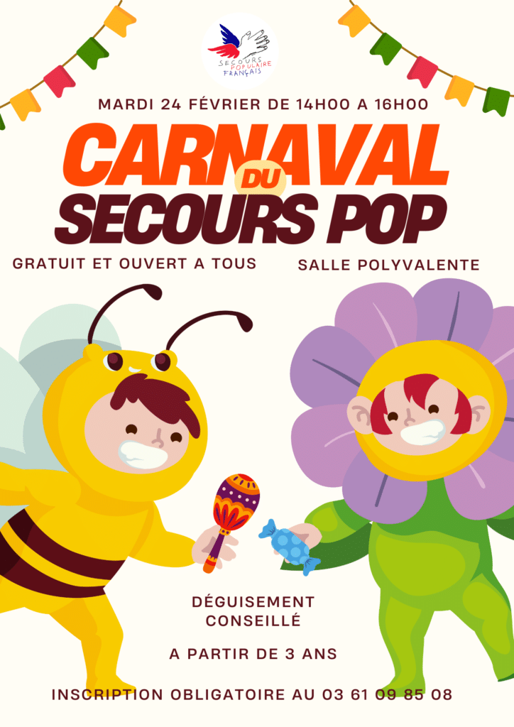 nous vous proposons une petite fête pour le carnaval le mardi 24 février de 14h00 à 16h00 dans la salle polyvalente du Secours populaire
