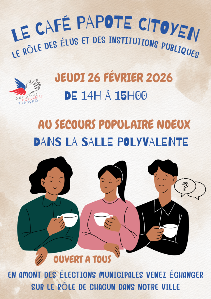 Le Secours populaire Noeux vous invite à son second café papote, dans la salle polyvalente de 14h à 15h le jeudi 26 février.